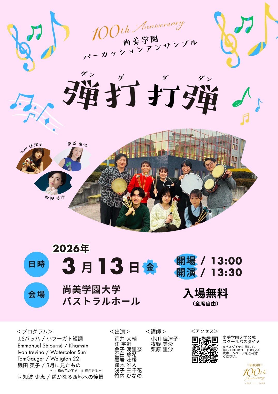尚美ミュージックカレッジは、学生一人ひとりの感性と夢を大切に育んできました。100周年を迎えるにあたり、これまでの歩みを支えてくださった皆さまへの感謝を深く胸(むね)に刻み、音楽と芸術の学びをさらに豊かにする環境づくりに努めてまいります。これからも創造性を育む教育を通じて、音楽文化の未来を担う人材の育成に取り組んでまいります。