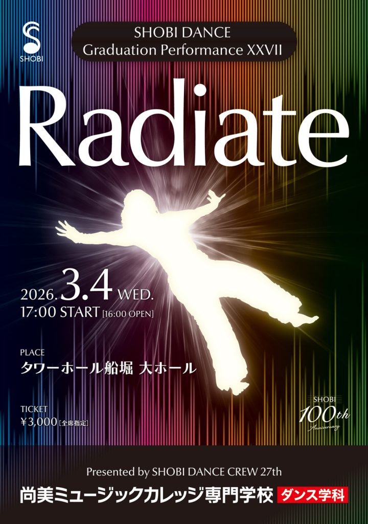 2026年3月4日(水)、尚美ミュージックカレッジ専門学校ダンス学科第27期生卒業公演 SHOBI DANCE Graduation Performance XXVII「Radiate」を、タワーホール船堀 大ホールにて開催します。