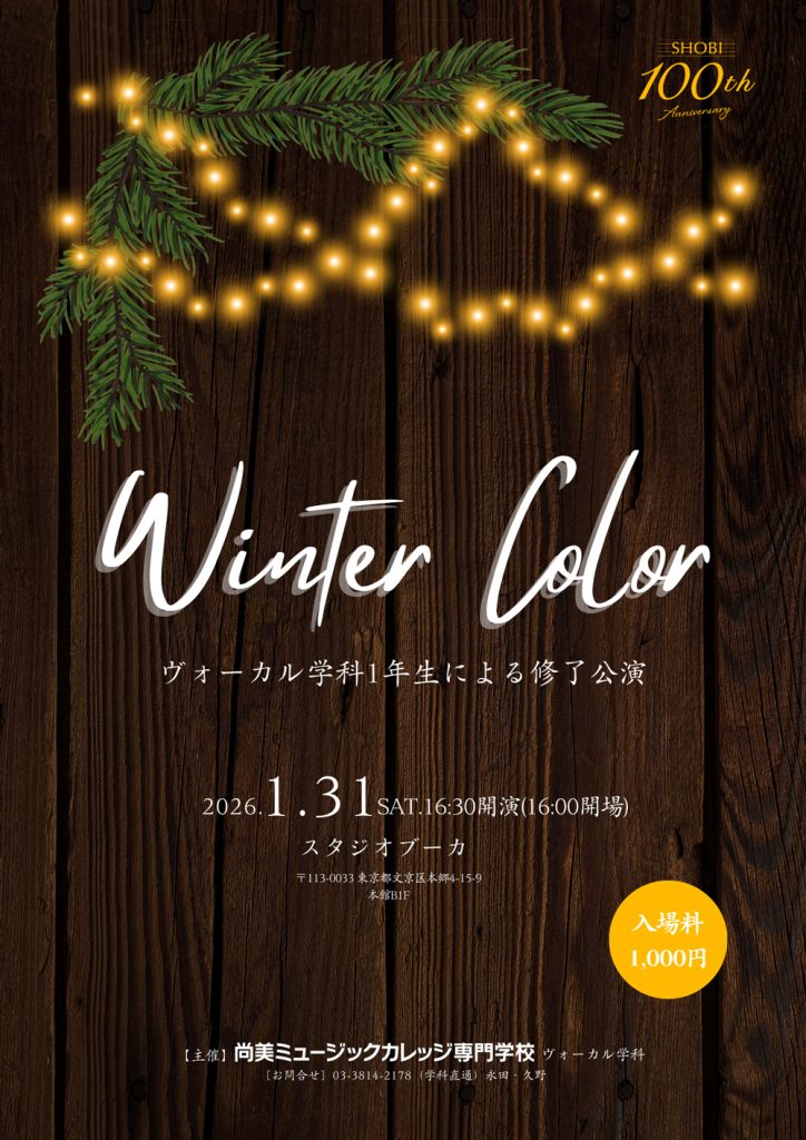 2026年1月31日、尚美ミュージックカレッジ専門学校ヴォーカル学科1年生による修了公演「Winter Color」を開催します。100周年を迎える尚美ミュージックカレッジ専門学校で学んだ成果を、最高のステージでお届けします。渾身のパフォーマンスをぜひ会場でお楽しみください!